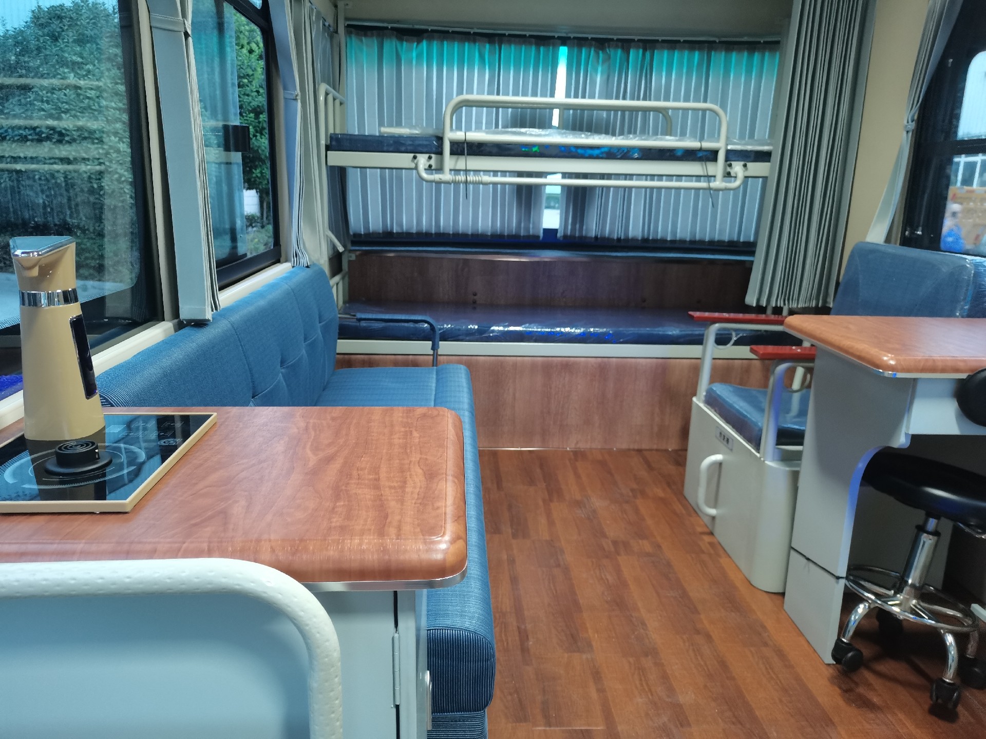 内饰涂装车体外部改制 | 车内整体装饰 | 1套 | 成型内饰顶,分区域浅色多层组合家装,红色吸膜台面 |